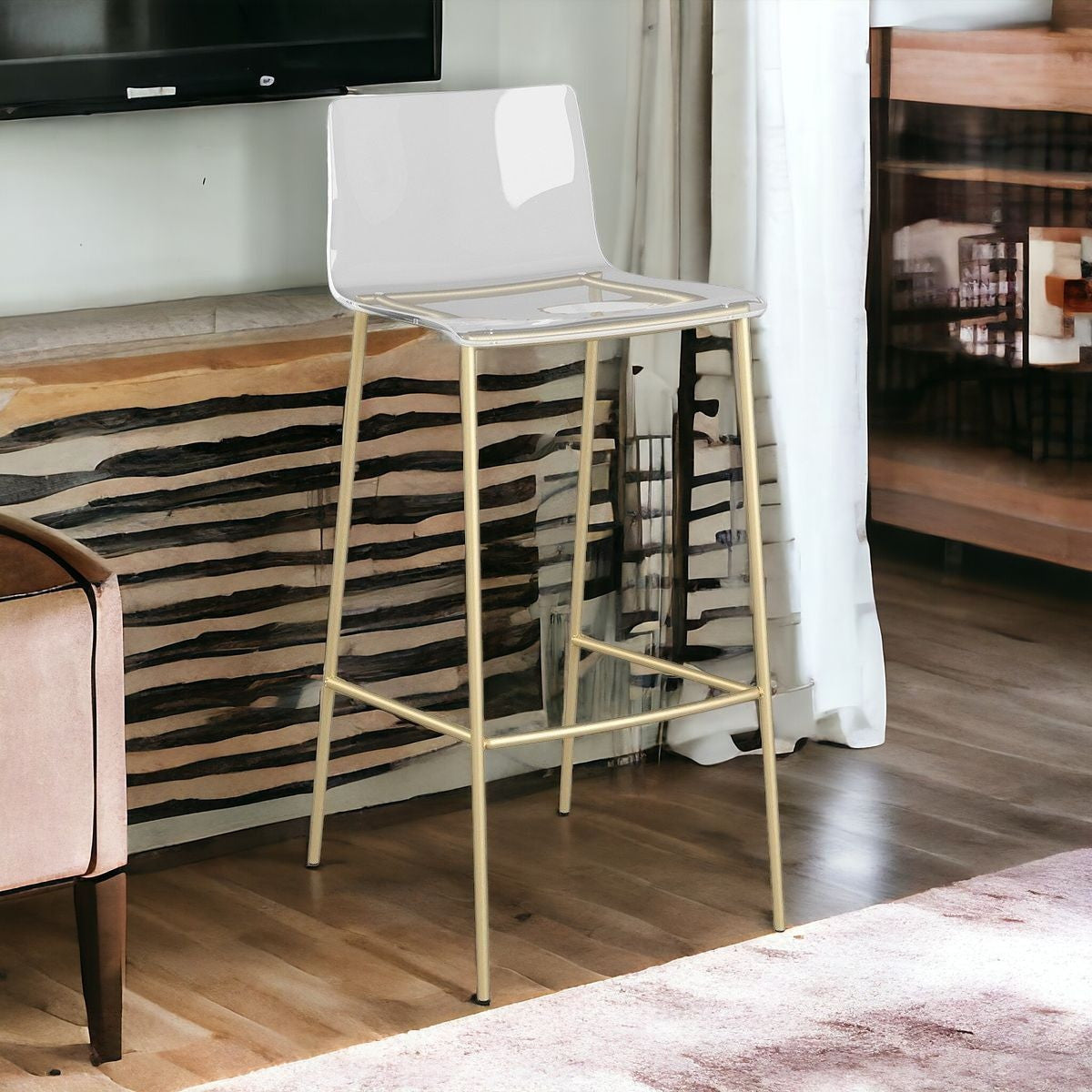 Set of Two 30" Clear And Gold Plastic Low Back Bar Height Bar Chairs With Footrest