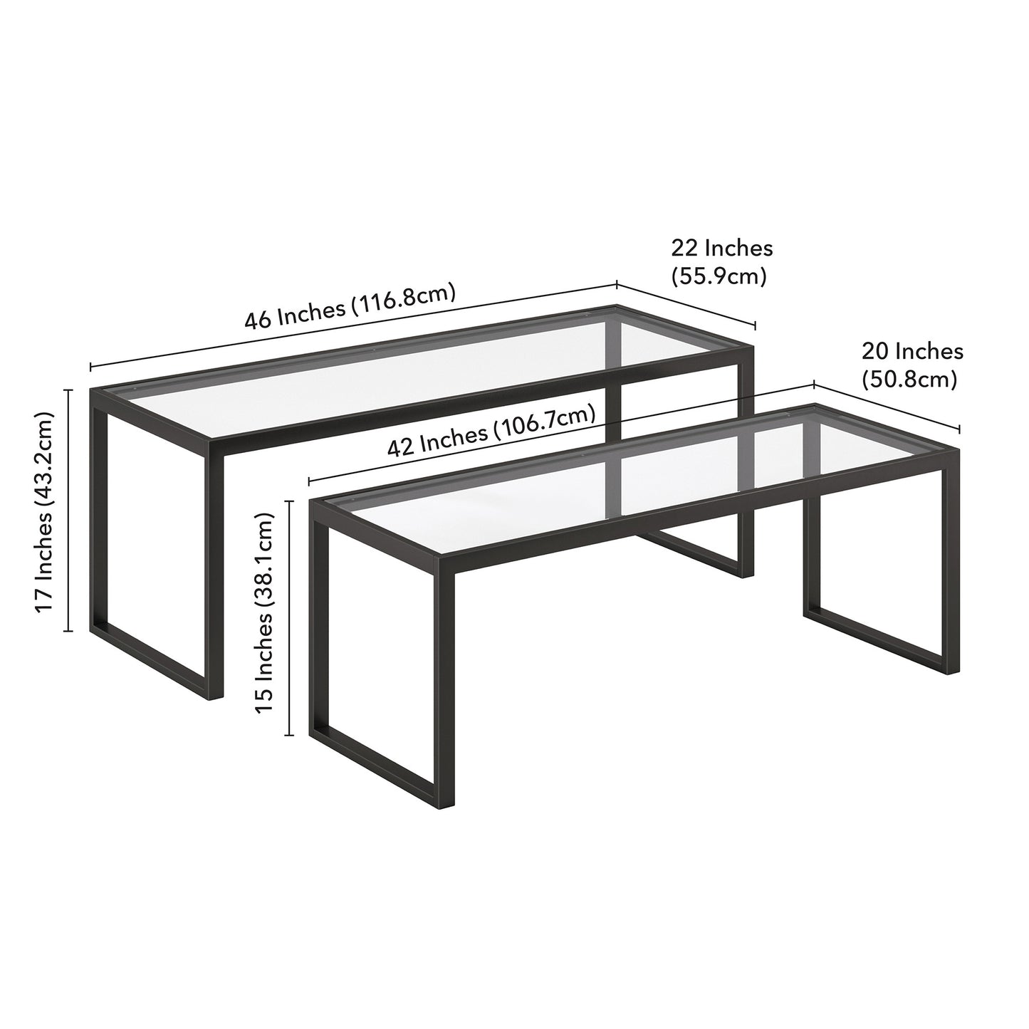Optimize your space with the set of two 46-inch black glass and steel nested coffee tables that nest into each other easily and fashionably when not in use. A sleek black monotone color gives this steel and glass table a fresh and updated look. This rectangular table is an classic yet updated way to accent your room. If you're looking for something that can fit into a living area, bedroom, or office, this coffee table is for you. This coffee table is the sturdy, reliable and stylish answer to your living room needs. 17-inch H x 46-inch W x 22-inch D