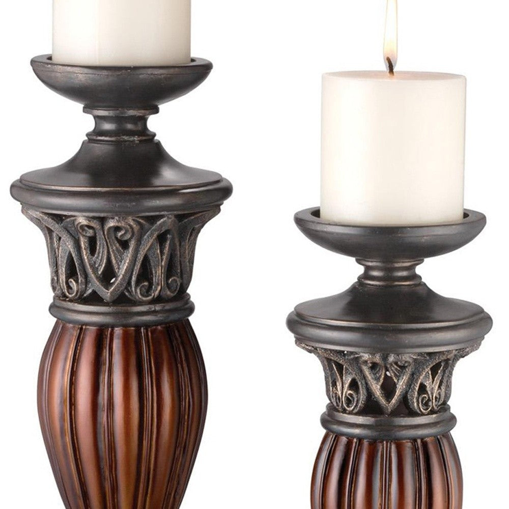 Set Of Two Bronze and Brown Tabletop Pillar Candle Holders