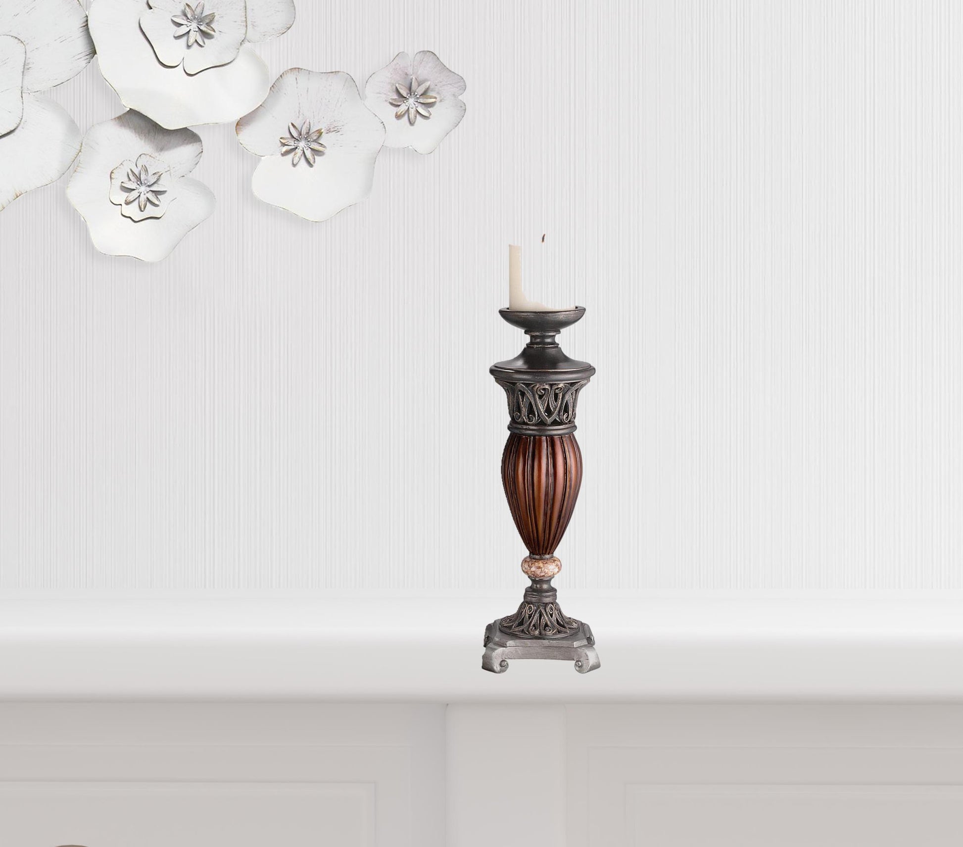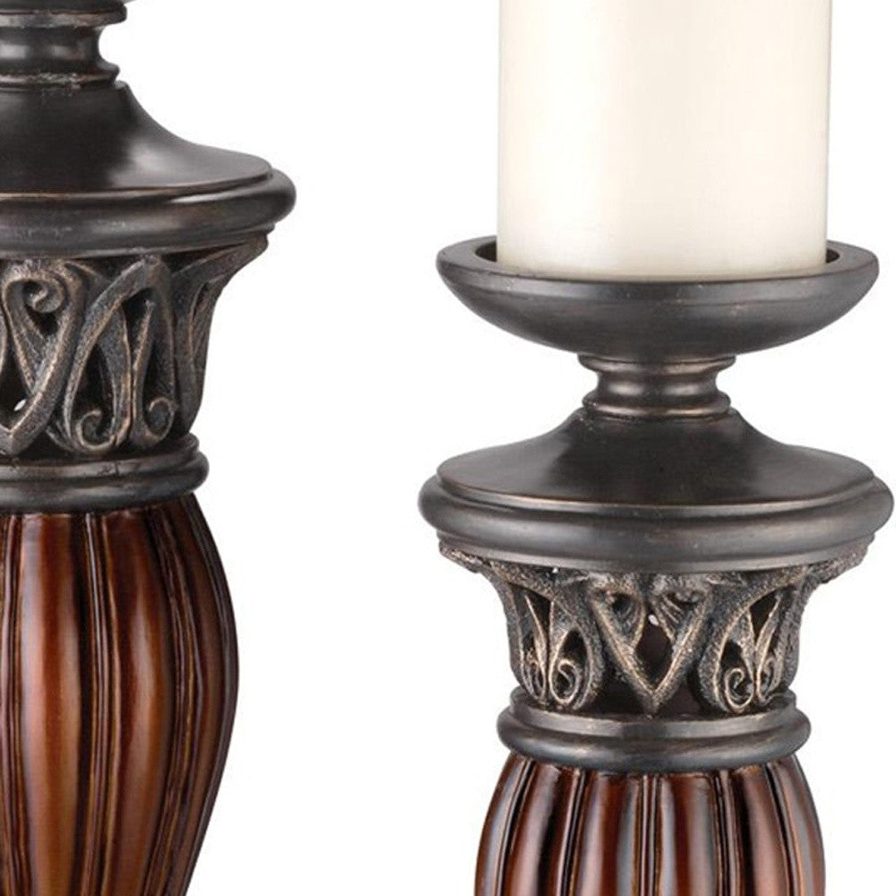 Bring the romantic glow of candlelight to your tabletop with this set of two bronze and brown tabletop pillar candle holder Ships with candles included for added value and ease of use. This candleholder is the perfect illuminating design to accent your space in style. Candleholders are a decorative accent on their own. They are also an attractive way to turn a simple candle into a piece of décor on its own. 13" H x 3.75" W x 3.75" D