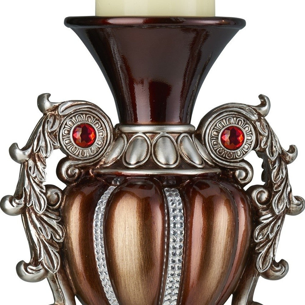 Illuminate any space with this set of two bronze tabletop urn shape pillar candle holders. Ships with candles included for added value and ease of use. This resin candleholder pair is the perfect illuminating design to accent your space in style. Candleholders are a decorative accent on their own. They are also an attractive way to turn a simple candle into a piece of décor on its own. 16.18" H x 5" W x 7.5" D