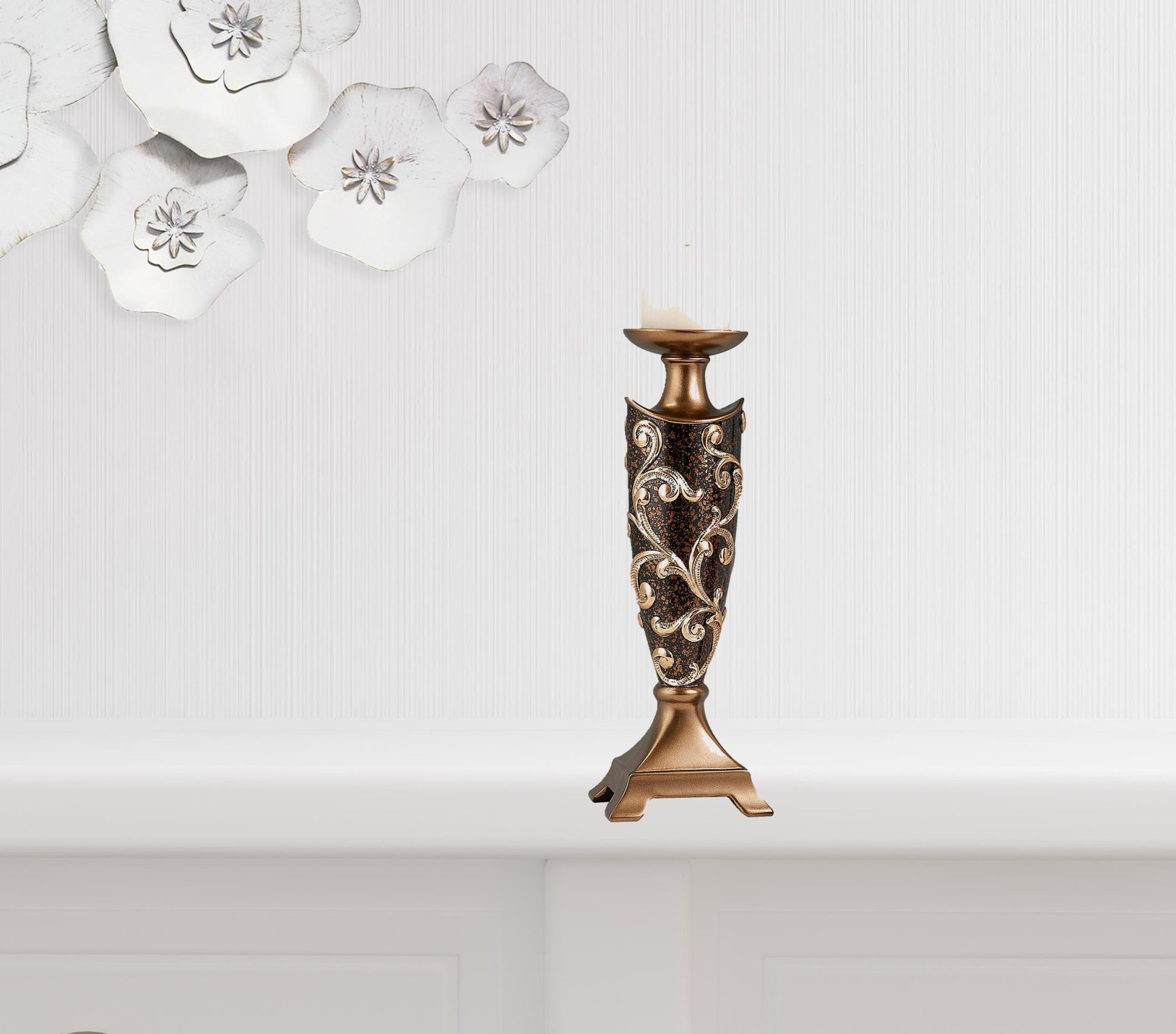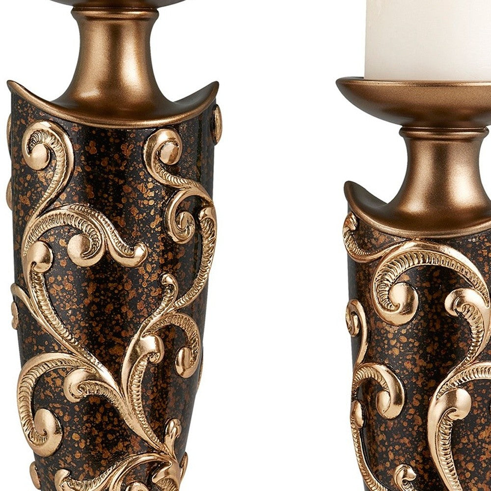 This set of two brown and gold pillar tabletop pillar candle holders is perfect for creating an elegant atmosphere on your tabletop or mantel. Ships with candles included for added value and ease of use. Dress up your home to impress every season with this fabulous candleholder. Candleholders are a decorative accent on their own. They are also an attractive way to turn a simple candle into a piece of décor on its own. 14" H x 4" W x 5" D