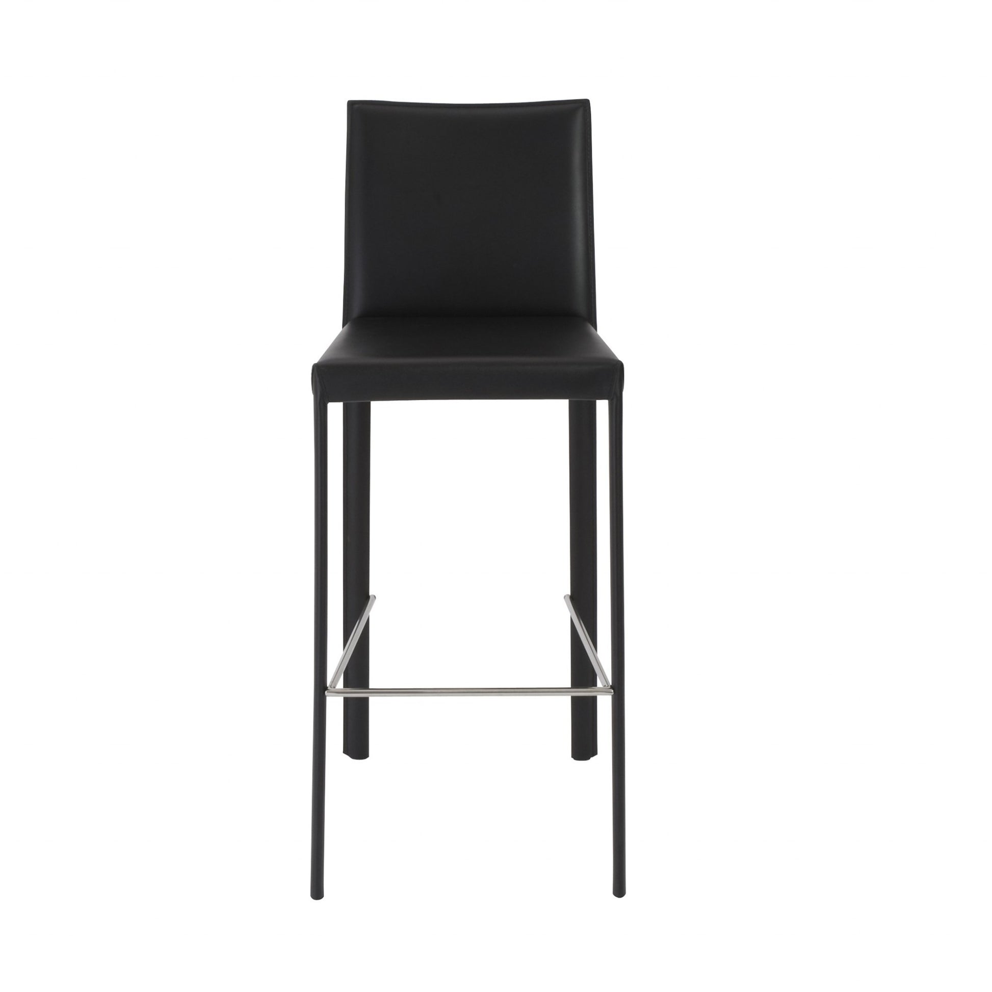 Add a touch of minimalist design and comfort to any dining space in your home with this Set of Two Full Black Faux Leather Bar Stools. This set has two bar stools made of sturdy solid steel base with a unique design style where the front legs are thinner than the back, and all legs, the frame, seat and backrest are covered in a soft and rich looking faux leather. Too offset the color of the leather there is a stainless stell footrest that wraps around on three sides. These sleek bar stools will look great in your bar lounge area, kitchen, dining room or even as extra seating in your game room. 40.95" H x 17.33" W x 21.07" D