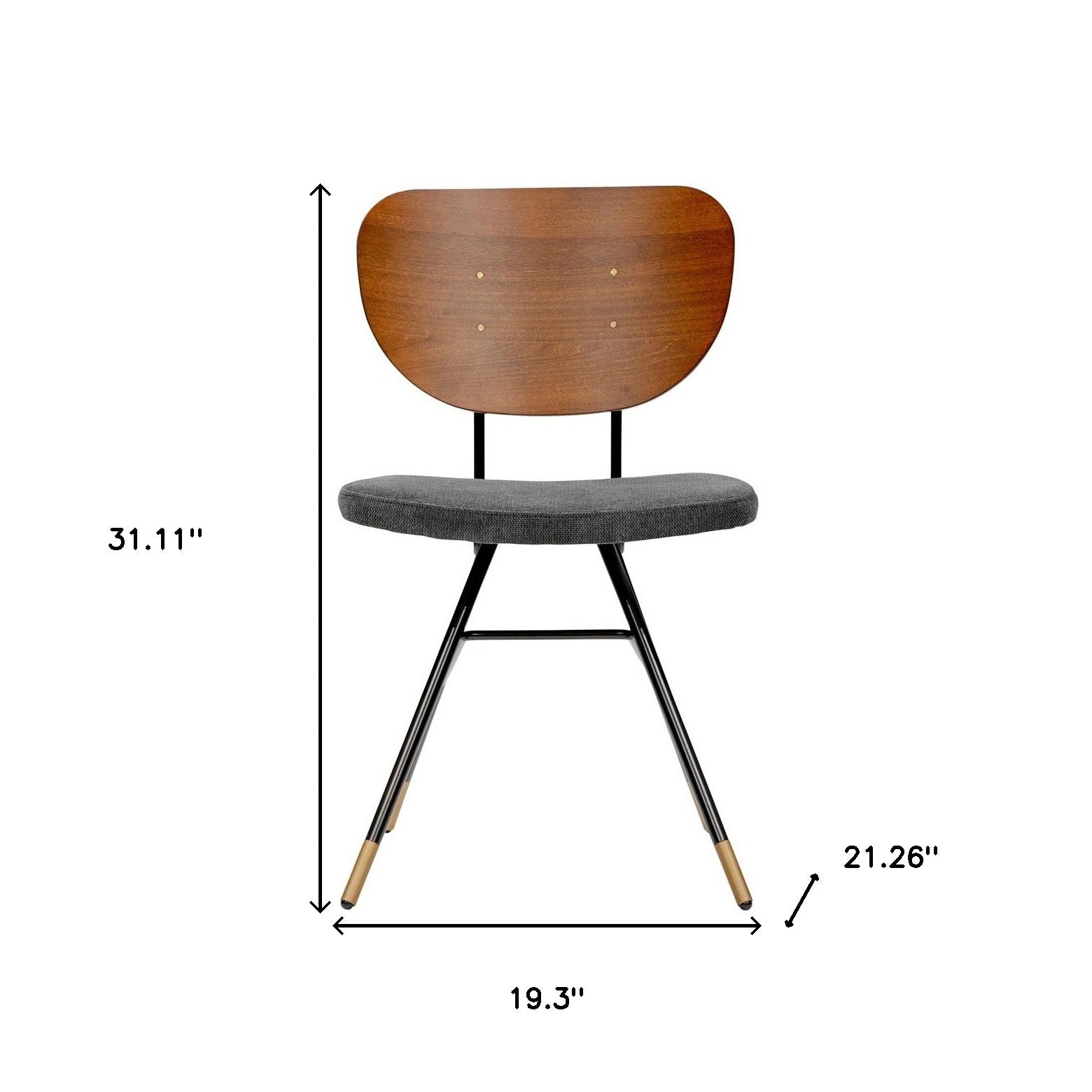 This Set of Two Wood and Steel Side Chairs will be the perfect addition to any space in your home owing to a combination of modern design and unmatched comfort. The two chairs in this set are made of a mixture of different materials. The base and frame are made of solid steel and finished to a black color. The legs are set at an angle with a horizontal bracket attached to the front legs. The bottom parts of each leg have gold accents on them. The seat is covered in a soft gray colored fabric which looks great against the solid light brown wooden back support. The wooden back support has a bowl inspired shape. Use these chairs in your living room, your bedroom, or even in your dining room. 31.11" H x 19.3" W x 21.26" D