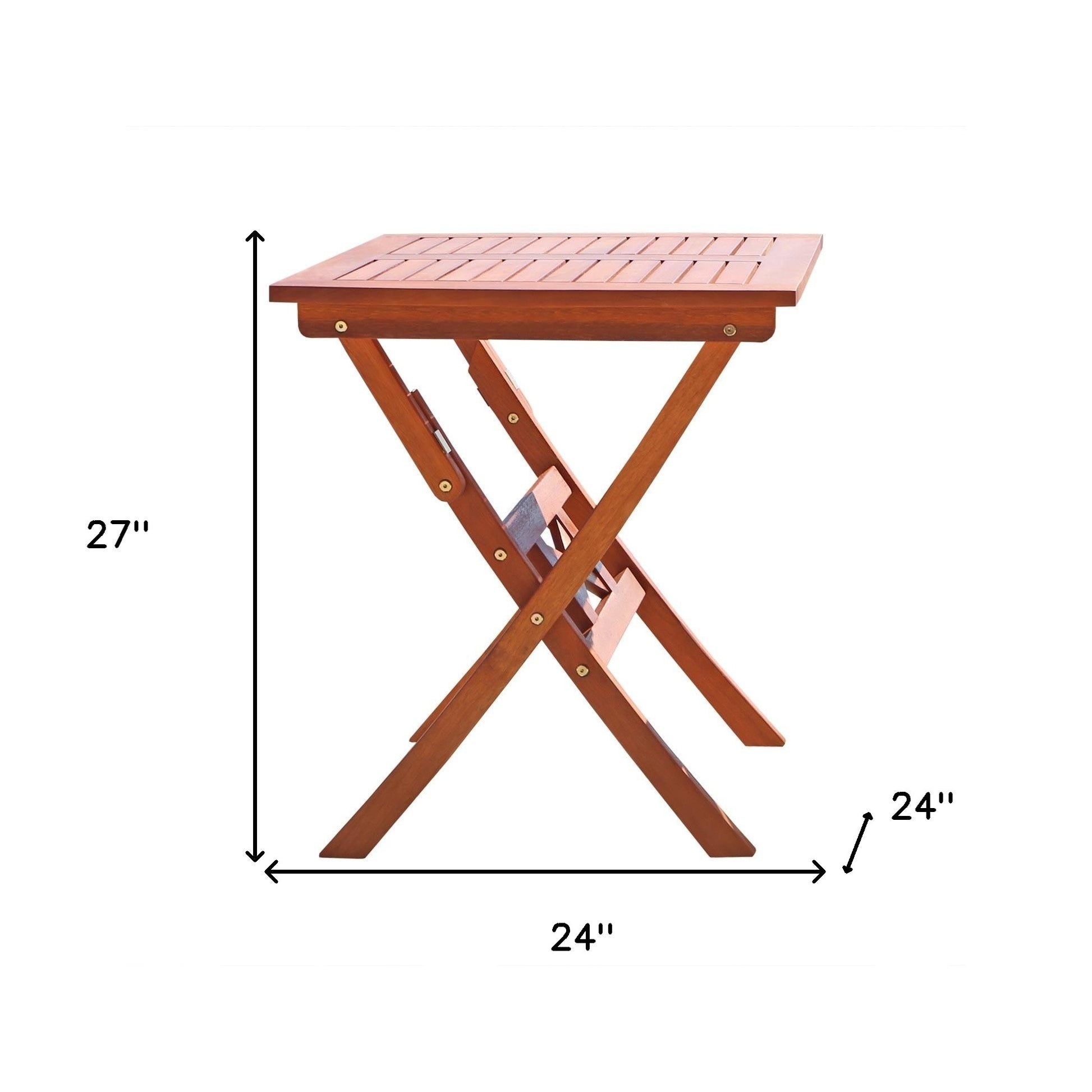 This Sienna Brown Folding Serving Table is perfect for holding and serving drinks in any outdoor patio space. This table adds character and versatility to your space with its fun slatted top and simple foldable storage design. Durable Eucalyptus and a beautiful oil-rubbed finish combine to make an equally sturdy and fashionable addition to your space. 27" H x 24" W x 24" D.