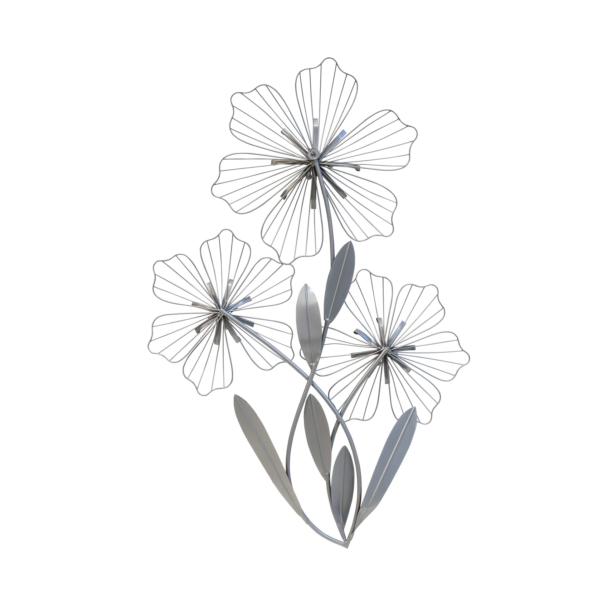 The silver and blue three flower sculptural metal wall decor is the perfect decorative accessory for your home. This decorative piece takes on the shape of a plant with three fully bloomed flowers, infusing nature's charm into your indoors. Fresh and clean this wall decor is will be a great addition to your living room, hallway, bedroom, lounge, or office. Adding this hanging wall art to your space to make your room feel more finished and attractive. Instantly liven up your space with this art that brings color and dimension to your walls. 30-inch H x 18.5-inch W x 1.25-inch D