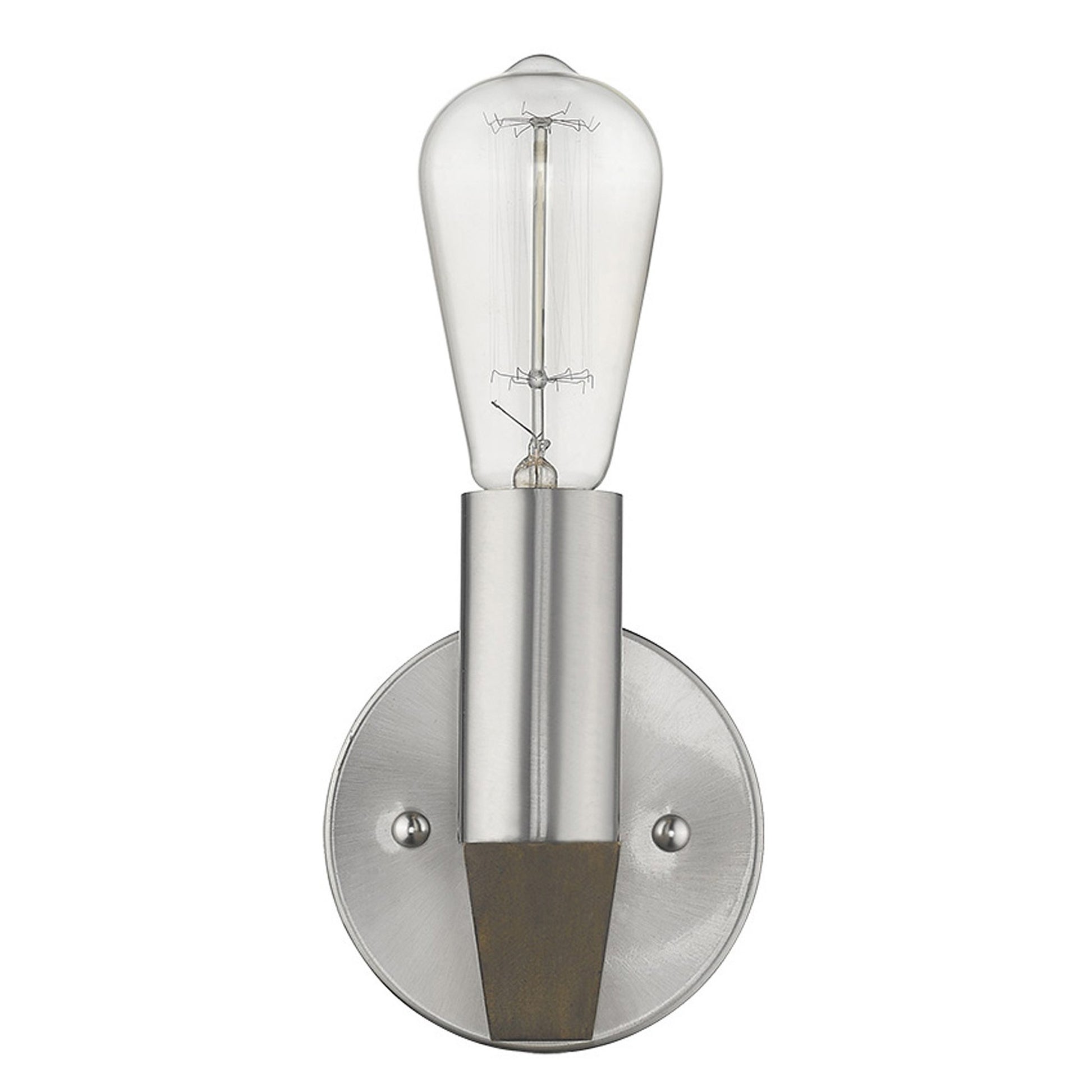 Different materials and colors come together beautifully in this Silver Metal and Wood Wall Sconce. The wall bracket has a simple round shape and is colored to a dull silver finish. Attached to the wall bracket there is a angled piece of wood that has a dark brown stain on it. The wooden piece has the simple silver cylindrical bulb holder attached to it. Transitional in styling, you can use Edison style bulbs for a rustic look, or use globes or tube bulbs for a more modern statement. This simple yet unique wall sconce will look great in your bedroom, your living room, or you kitchen. You can use it on its own or you can use it in groups around your home. 5.75" H x 4.75" W x 4.5" D