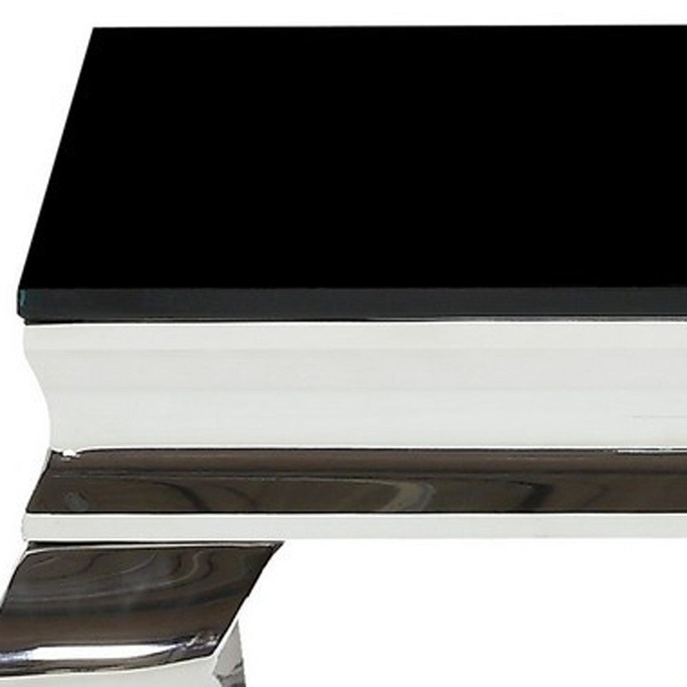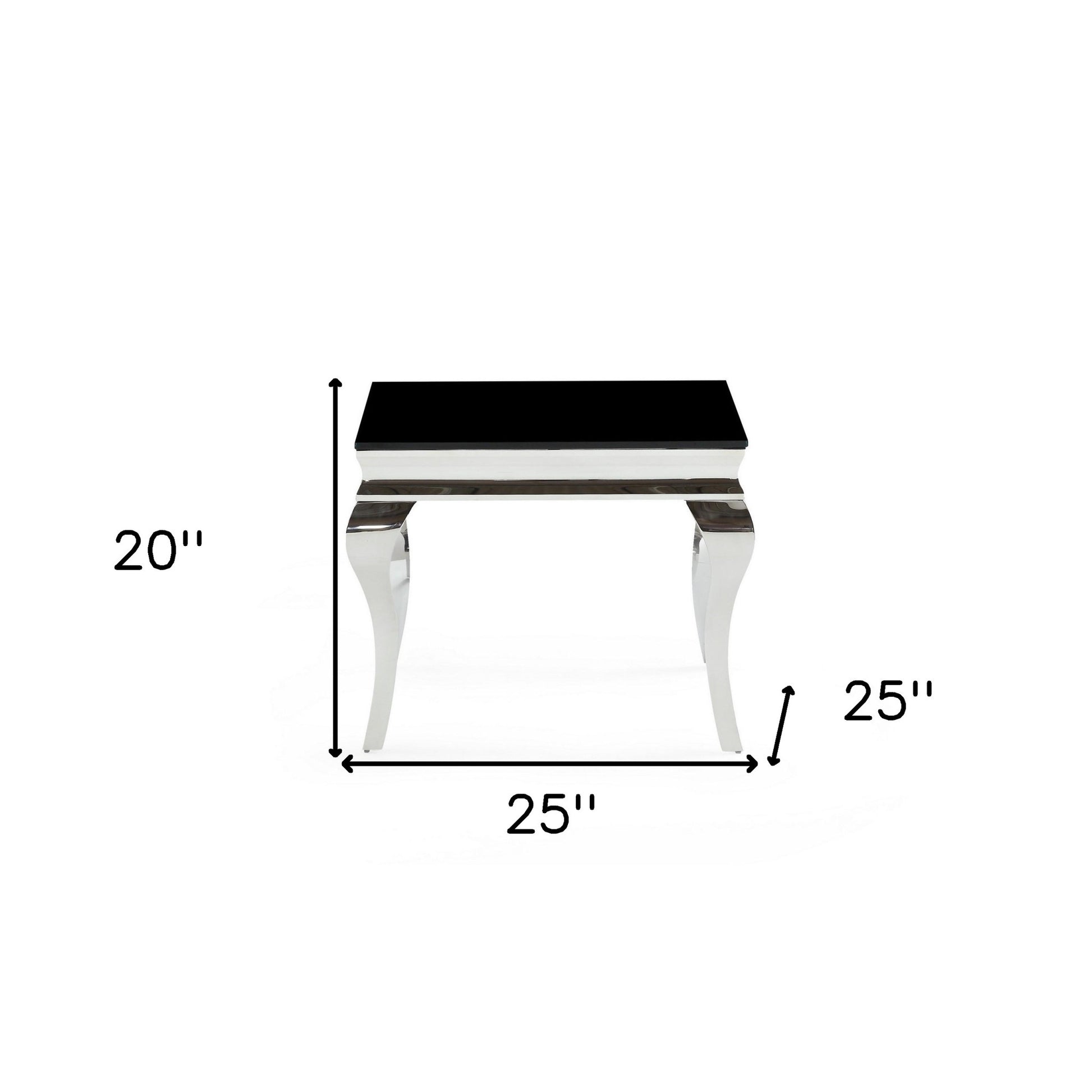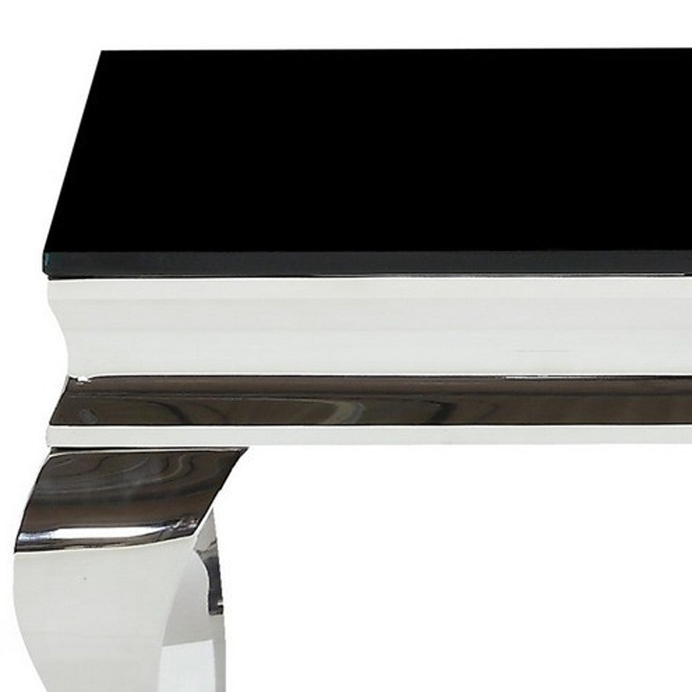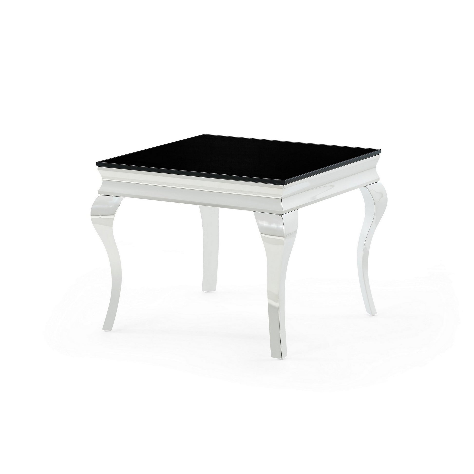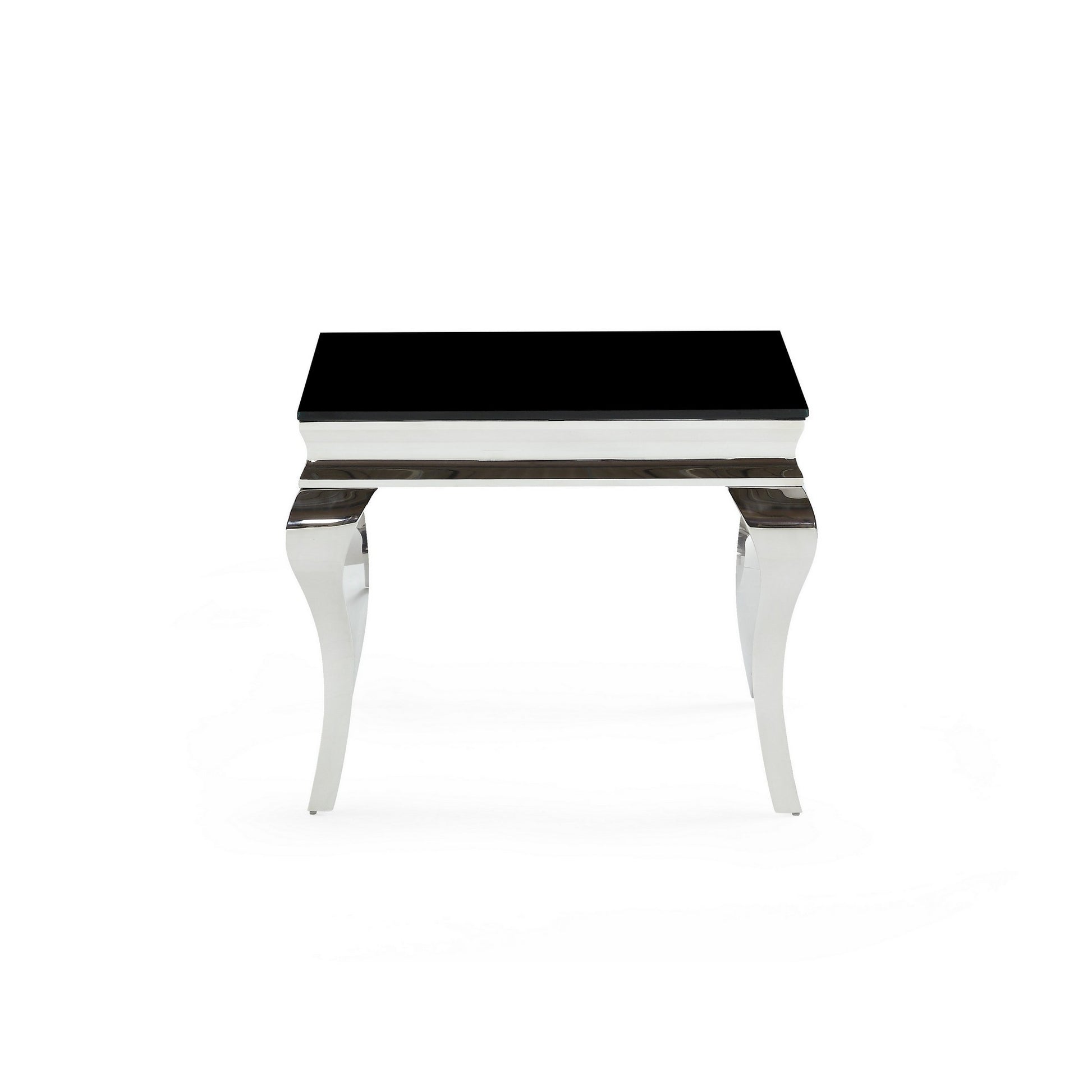 Evoking earlier times with a touch of modern appeal, this end table will be a welcome addition for your home. The black and silver tones of this table give it a chic look and make it an easy fit for abundant existing room settings and a great way to update room decor. It include attractive black glass tabletop and sleek silver toned style trim and legs which together create a visually appealing look. Expansive tabletop provides ample room for use in entertaining as a serving area or for display. Quality craftsmanship in all facets of production ensures durability and long-lasting wear. Beautiful in its classic style and versatile in form and function, this end table is a must have piece for your home and will be an asset in entertaining for years to come.