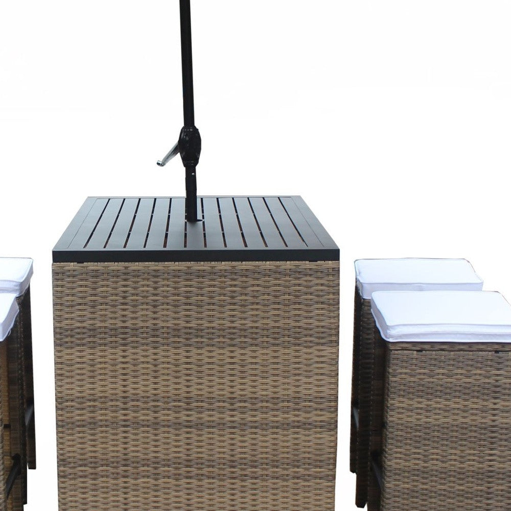 Six Piece Brown and White Faux Wicker Outdoor Bar Height Table Set with Umbrella and Stools