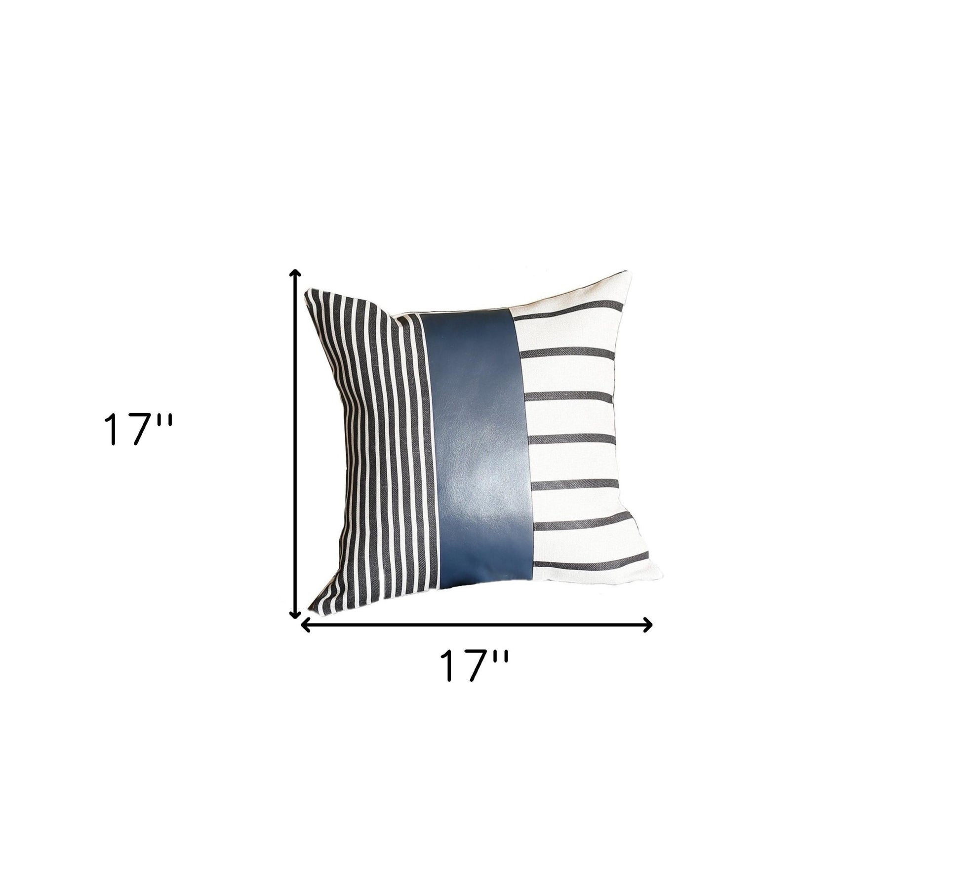 The pleasant Bohemian vibe of this Traditional Navy Blue Faux Leather and Monochromatic Stripes Lumbar Pillow Cover in your living space will leave a mark of its own. For an eye-catching visual effect, this square-shaped lumbar cover is designed with horizontal and vertical stripes on two ends with a pronounced navy blue faux leather finish in between for a distinct look. With a hidden zipper all-around, the soft and stylish pillow cover is an ideal addition for your bed, sofa, or a fun sitting section in the living room. 17" x 17" x 0.08”