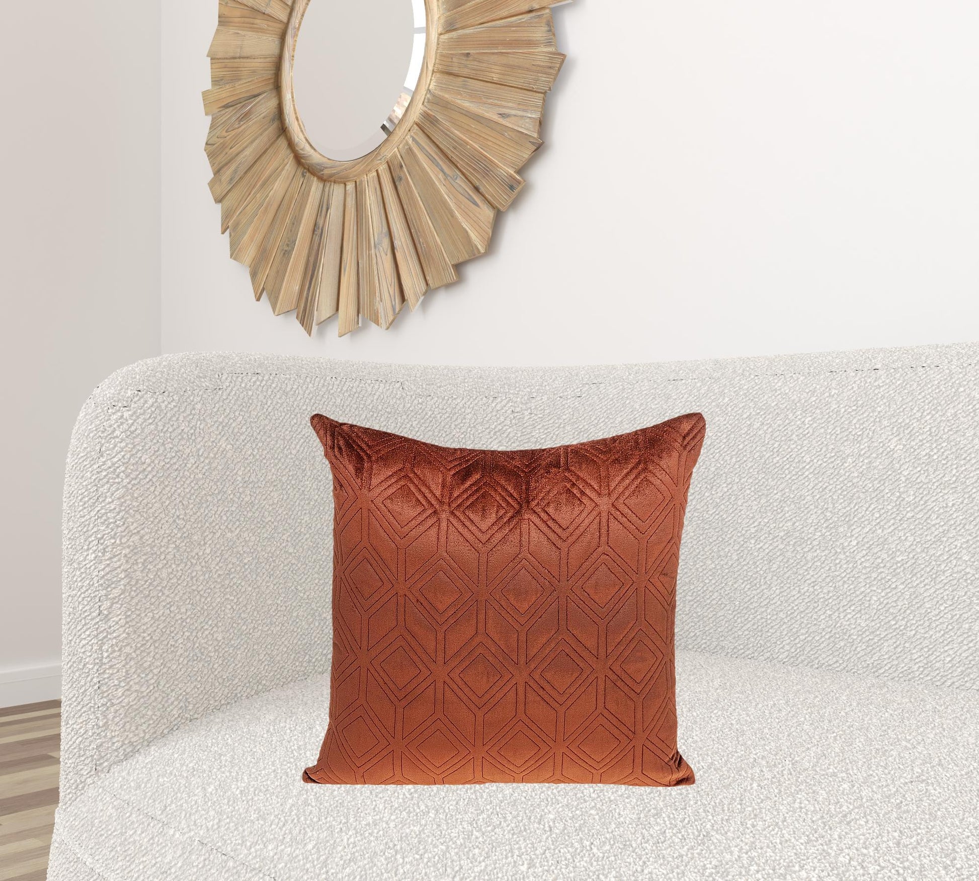 Add some style and fashion to your space with this Tufted Diamonds Terra Cotta Velvet Accent Pillow. This super soft to the touch pillow in a bold and striking color features quilted diamond geometric tufted design on the front and solid color on the back. The back also features a hidden zipper flap for convenience. This soft textured decorative square pillow is a great way to bring some classic elegance and a pop of color to your space. Add this generously sized pillow to update your sofa, chair, or bedroom. 20" x 20" x 4".