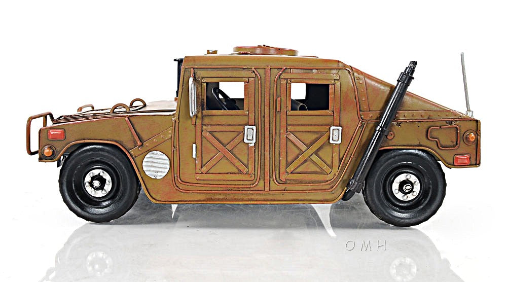 Eyecatching and super realistic, the US Army Humvee Sculpture is a unique handmade replica of the iconic multipurpose vehicle. It features many details, like headlights, seats, steering wheel, exhaust, and large fenders. 100% made from metal with an authentic army paint finish. With a 1:15 scale, it is a sought-after model for automotive and army enthusiasts. 4.5" x 13" x 7.5"