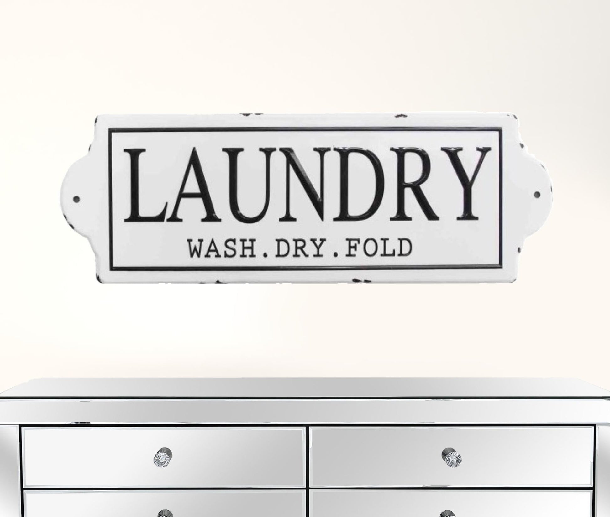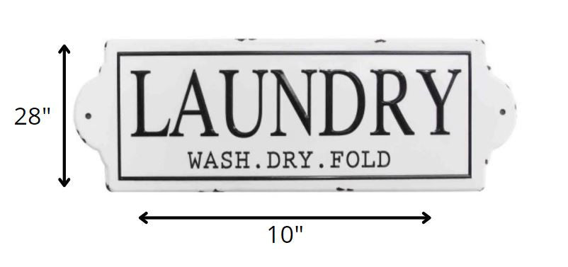 Get your beloved home setting updated with our laundry wall decor. This stunning wall piece is intricately designed and handcrafted from metal. It features a white enamel-like coating back carrying black LAUNDRY sign with a clear instruction that reads WASH. DRY. FOLD. Definitely this masterpiece will be a perfect accent on any wall in the laundry room. Farmhouse style Metal Saw-tooth hanging method Horizontal hanging orientation Wipe clean with damp cloth It comes ready to hang - Item is handmade and painted by skilled artisans - Product may have some variances in comparison to photo shown. It measures 10" X 0.51" X 28".
