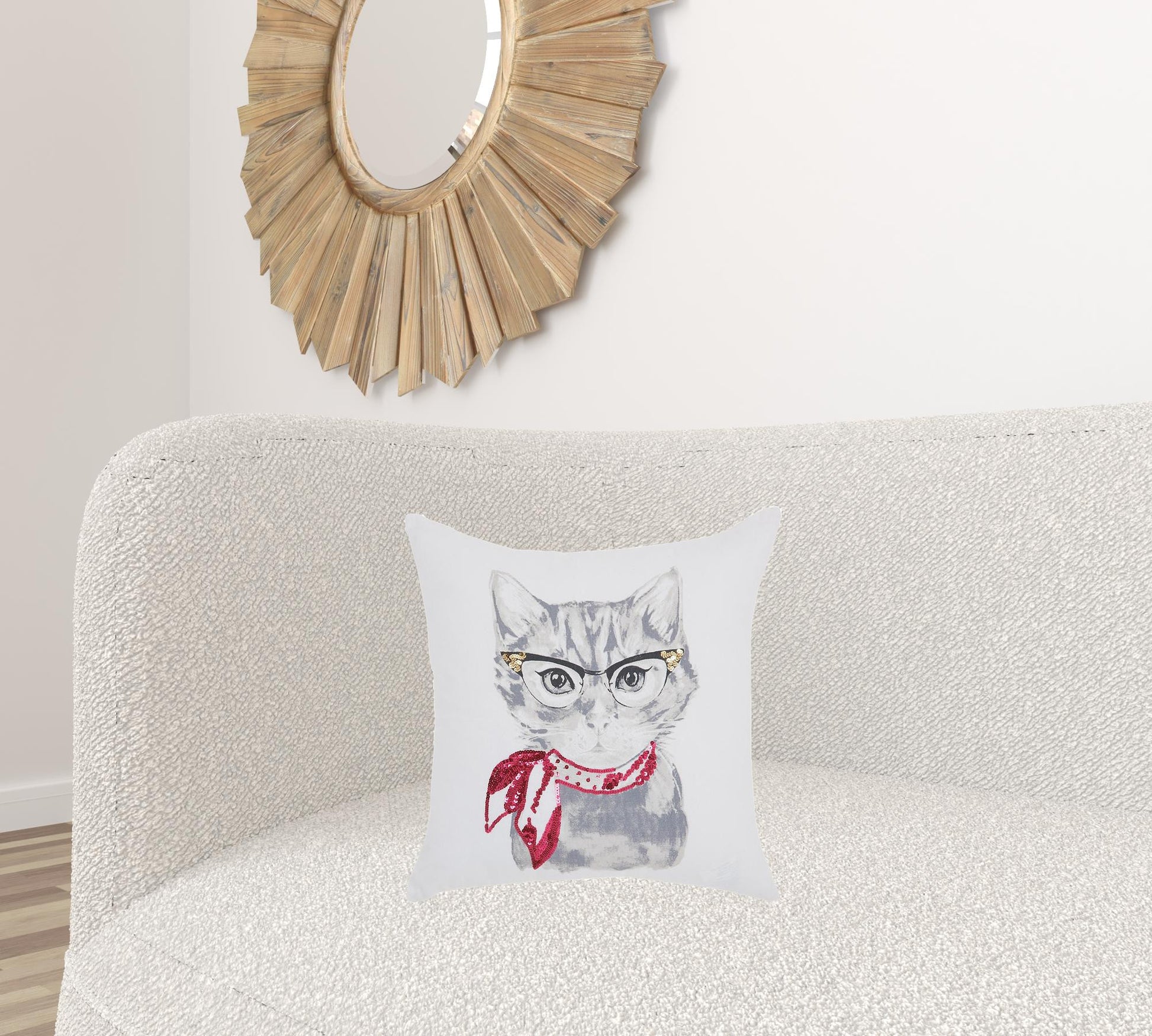 Let's put a big smile on your face with this adorable White and Red Cool Kitty Throw Pillow in your space. The adorable and playful bespeckled kitten graphic is bound to strike a chord in everyone’s heart in the coziest way while the pristine sequin work on the scarf add an eye-catching pop of color. The durability is unquestionable due to the use of high-quality 100% cotton on the outside and filled with fluffy polyester to give you the best complete experience. Add some decorative whimsy to your space with this adorable pillow. 18” x 18” x 5”