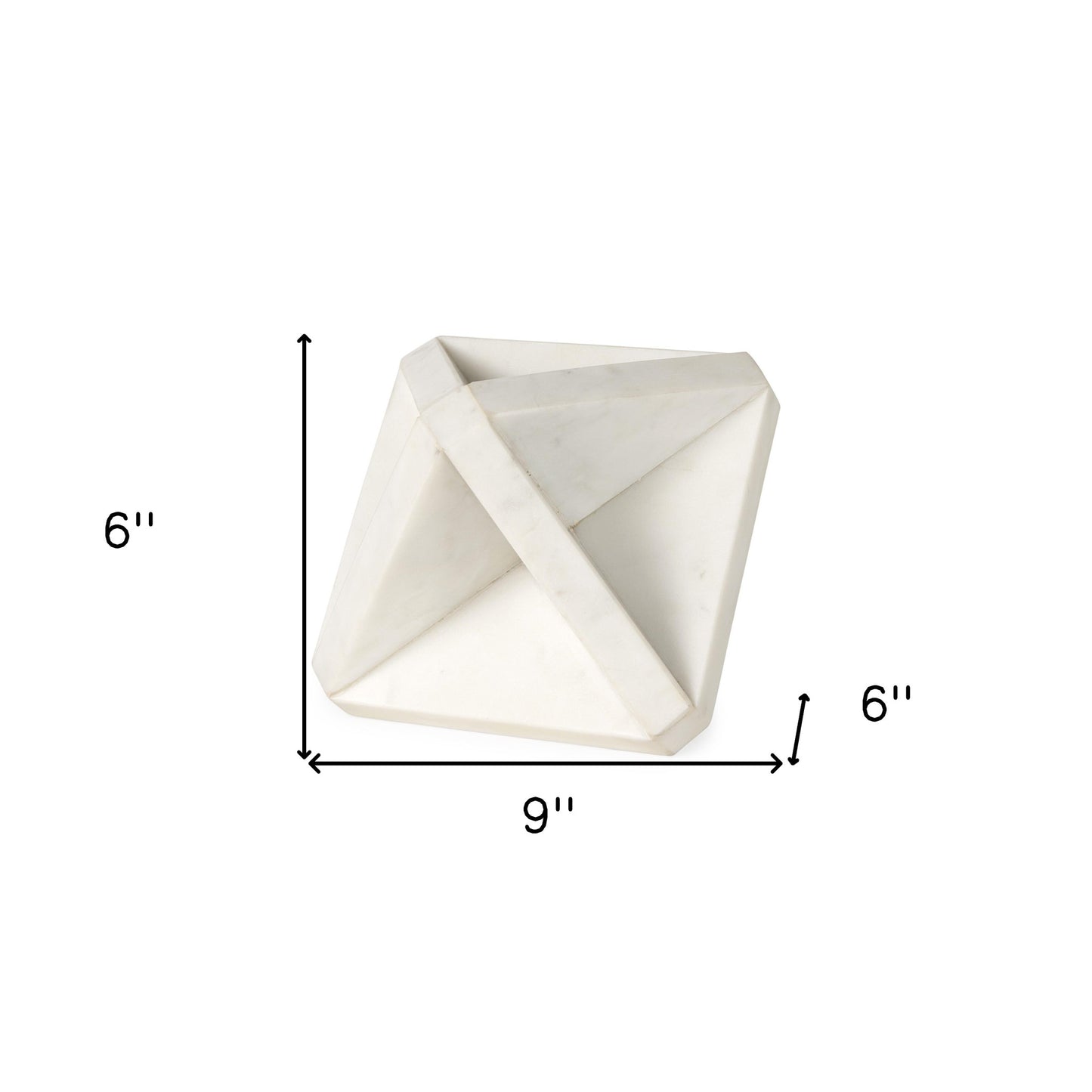 This White Marble Geometric Square sculpture is the perfect way to add a touch of minimal contemporary design to your home. This piece is made from solid marble which is in a white color with beige veining running through it. The base of the piece has a rounded square shape with two triangle shapes on top of it. The triangles intersect in the middle and create an X-shape that has a 3D feel to it. This piece has a very understated look which makes it suitable for any interior decor style or colors you already have. Use it as part of your existing decor or as a stand-alone piece anywhere in your home and elevate the whole space. 9" H x 6" W x 6" D